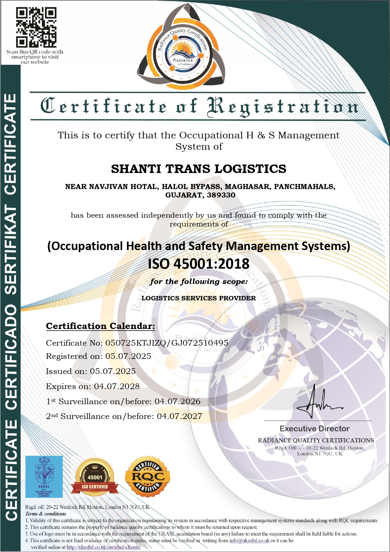 Shanti Trans Logistics is ISO 9001:2015 certified for providing high-quality logistics services. Our operations are aligned with international standards to ensure reliable and compliant service delivery.